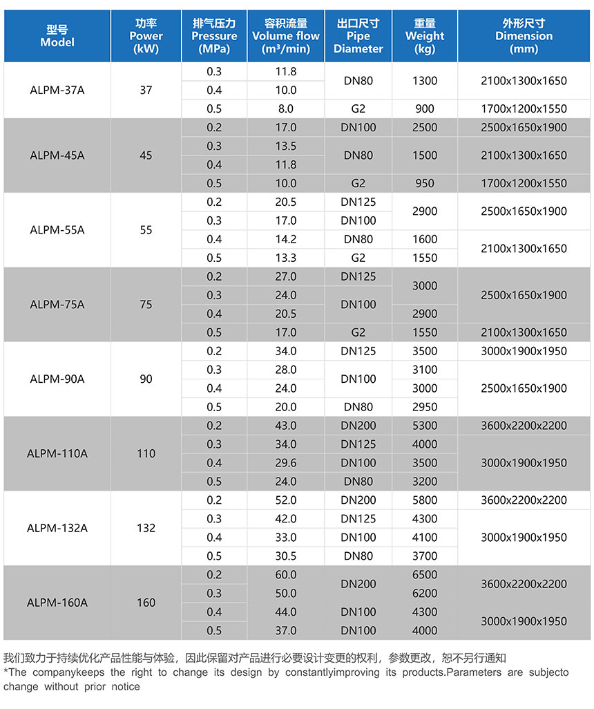 APML系列 (整机终生质保)排气量:8.0~ 60.0 m3/min 工作压力:0.2 ~ 0.5 Mpa 额定功率:37 ~ 160 kW